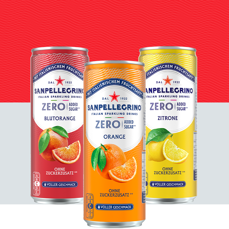 Sanpellegrino Ein Hauch von überrascht mit einer Mischung aus echtem Fruchtsaft und prickelnder Kohlensäure. Jede Dose hat nur rund 33 Kalorien und ist frei von Süßstoffen.