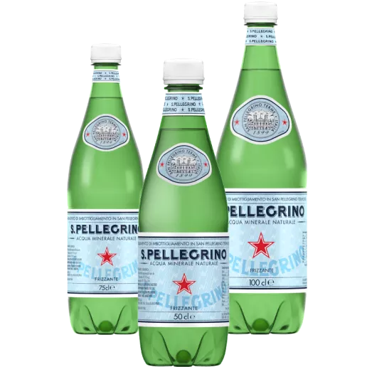 S.Pellegrino acqua minerale naturale frizzante, bottiglie in plastica riciclata rPET e PET