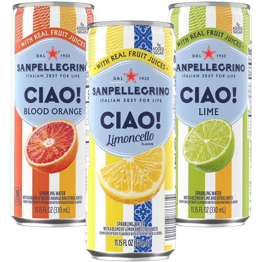 Sanpellegrino CIAO! is a flavored sparkling water with real fruit juices, balanced by a pinch of Sicilian salt. Available in four different flavors, it offers a refreshing taste of the Italian zest for life, with zero grams of added sugar and just 10 calories or less per can.